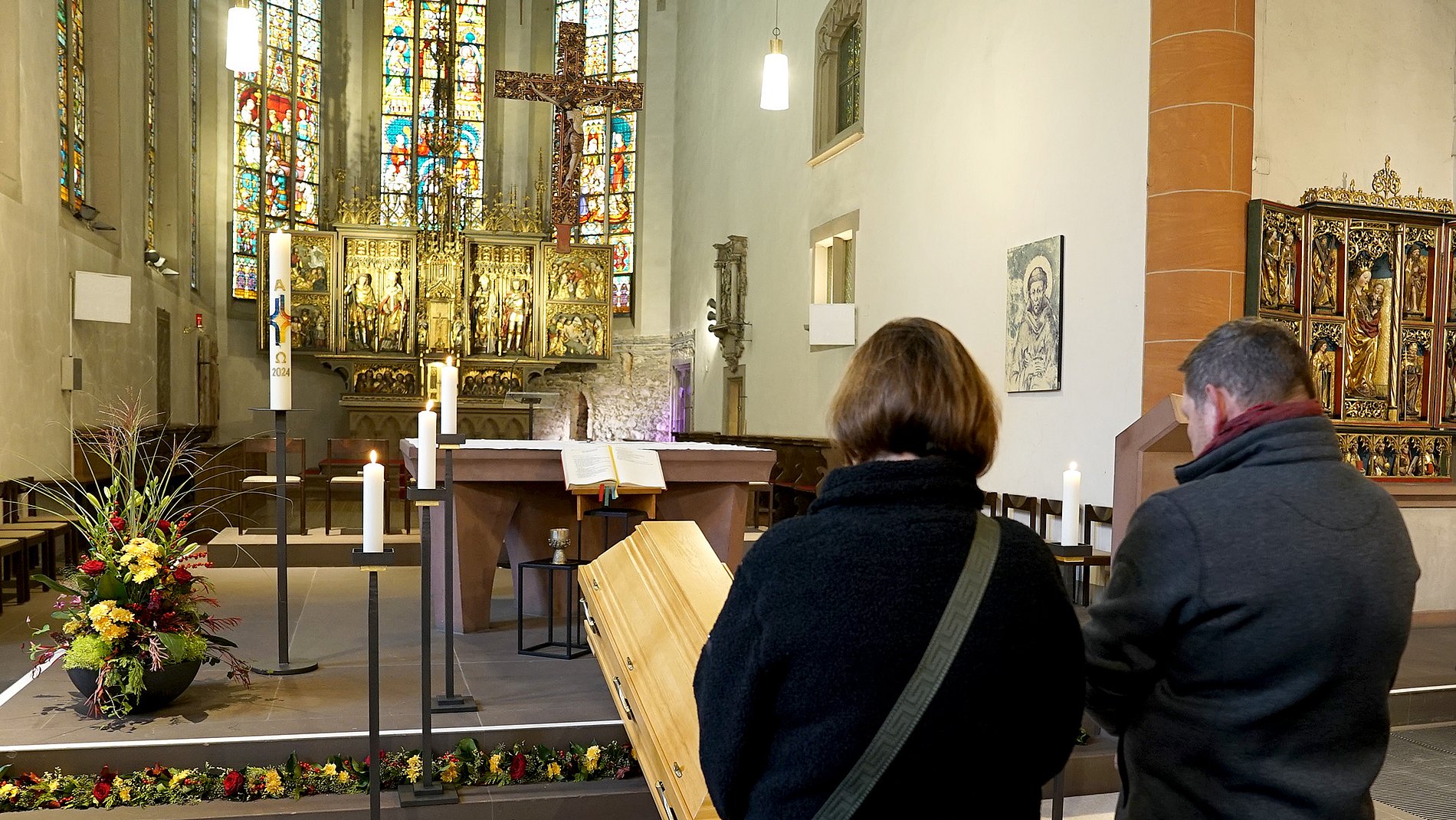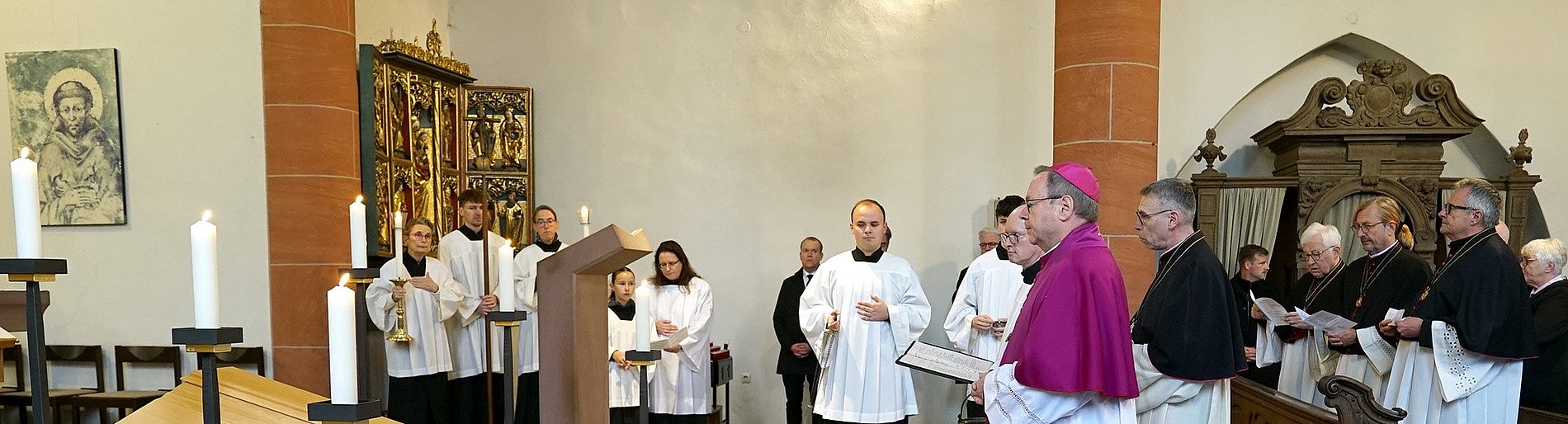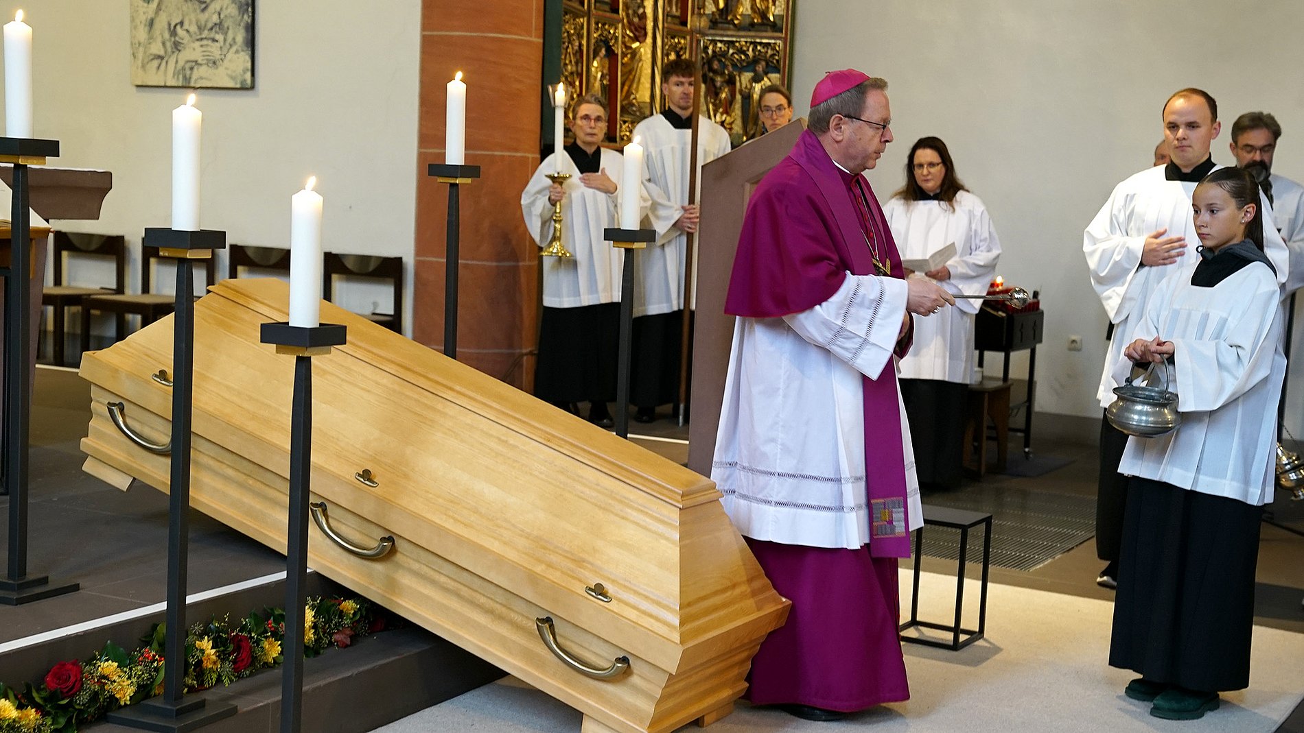 Der verstorbene Bischof em. Dr. Franz Kamphaus ist am Samstag, 2. November 2024, in der Stadtkirche Limburg aufgebahrt worden. Bis einschließlich Montag, 4. November, können Gläubige dort am geschlossenen Sarg des früheren Limburger Bischofs Abschied nehmen und sich in das ausgelegte Kondolenzbuch eintragen.