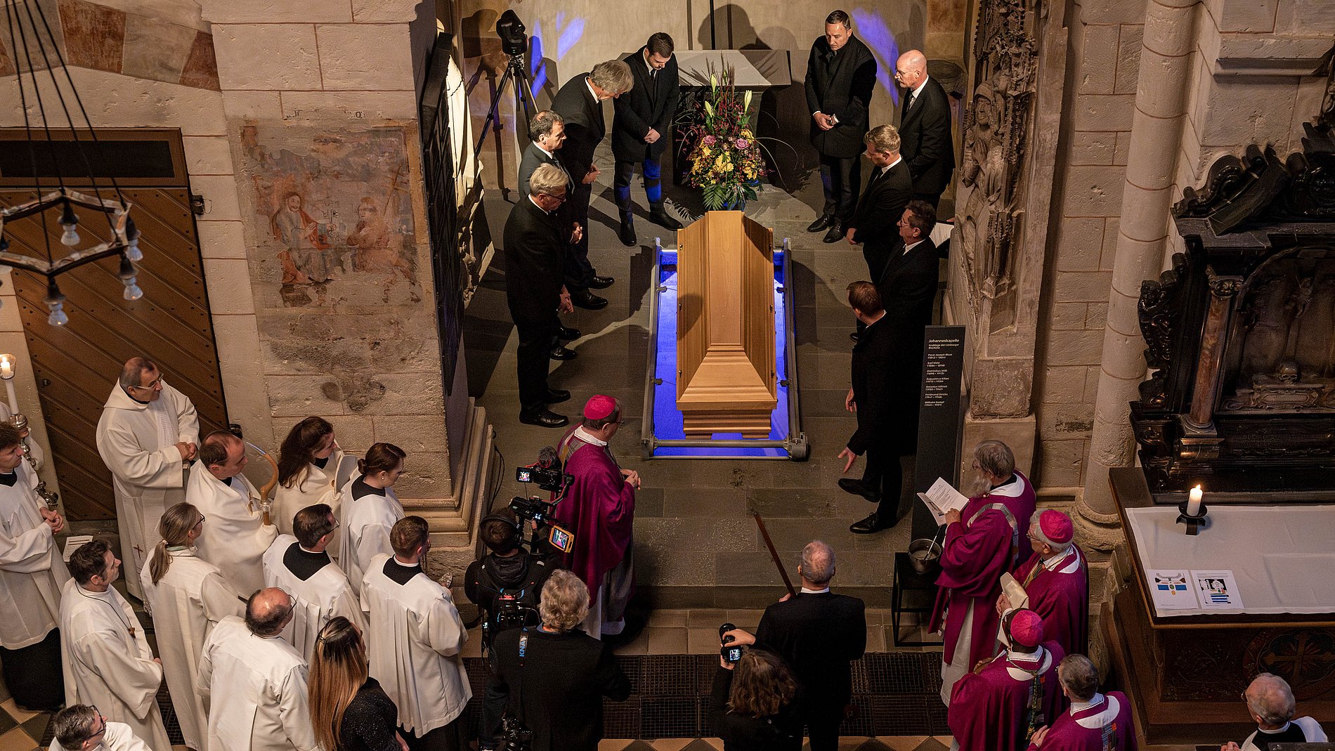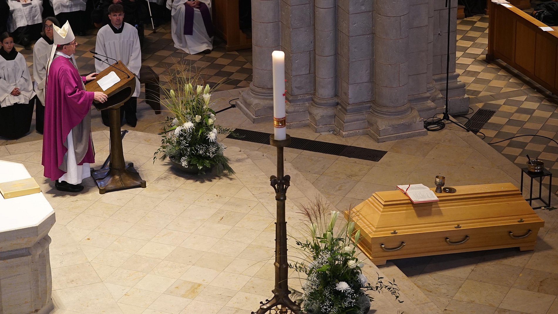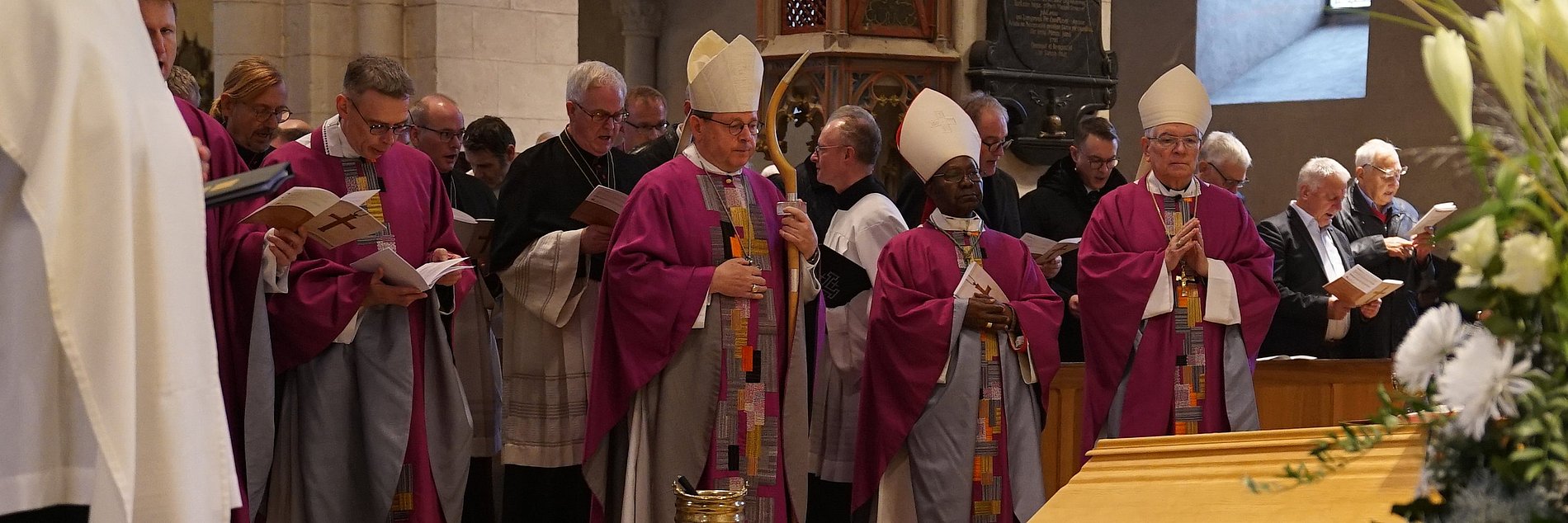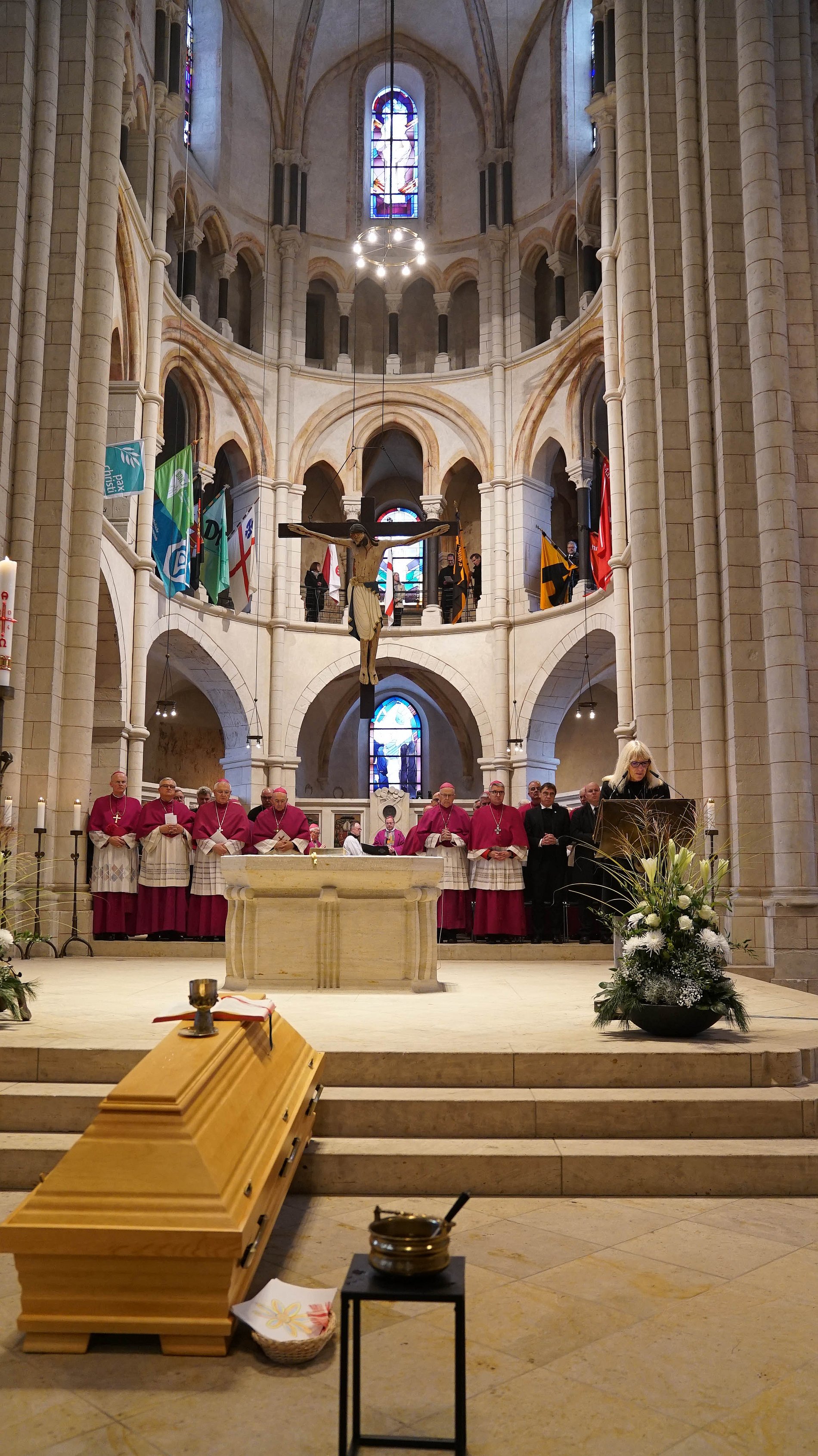 Bischof em. Dr. Franz Kamphaus ist am Dienstag, 5. November 2024, im Hohen Dom zu Limburg beigesetzt worden. Der charismatische Altbischof, der am 28. Oktober im Alter von 92 Jahren verstorben war, fand seine letzte Ruhe in der Gruft im Südquerhaus der Bischofskirche. Zu den Trauerfeierlichkeiten kamen mehrere hundert Menschen, darunter zahlreiche Bischöfe, Weggefährten, Verwandte, Vertreterinnen und Vertreter aus Politik und Gesellschaft sowie viele Gläubige aus dem gesamten Bistum. Das Pontifikalrequiem für den Verstorbenen, das von tiefer Dankbarkeit für das Wirken von Kamphaus geprägt war, feierte Bischof Dr. Georg Bätzing.