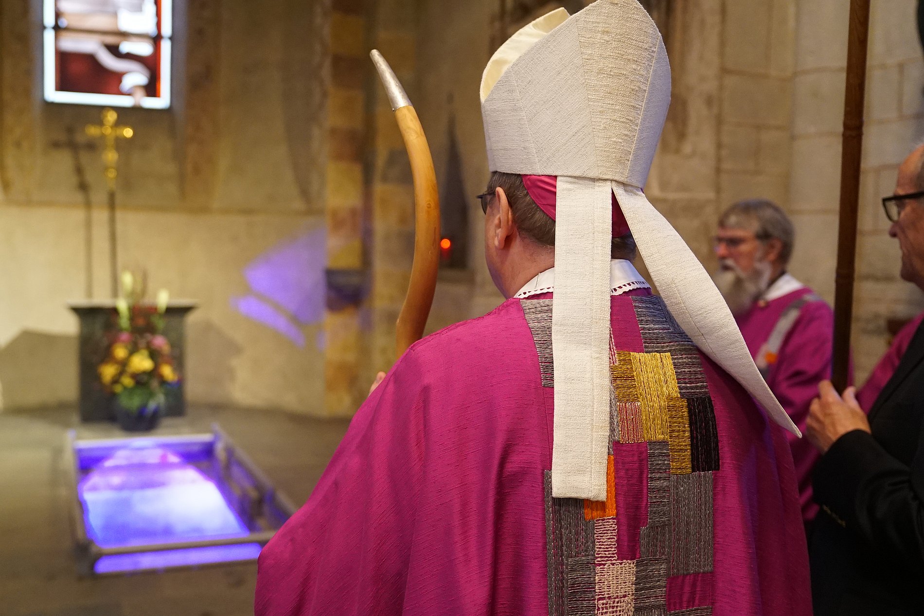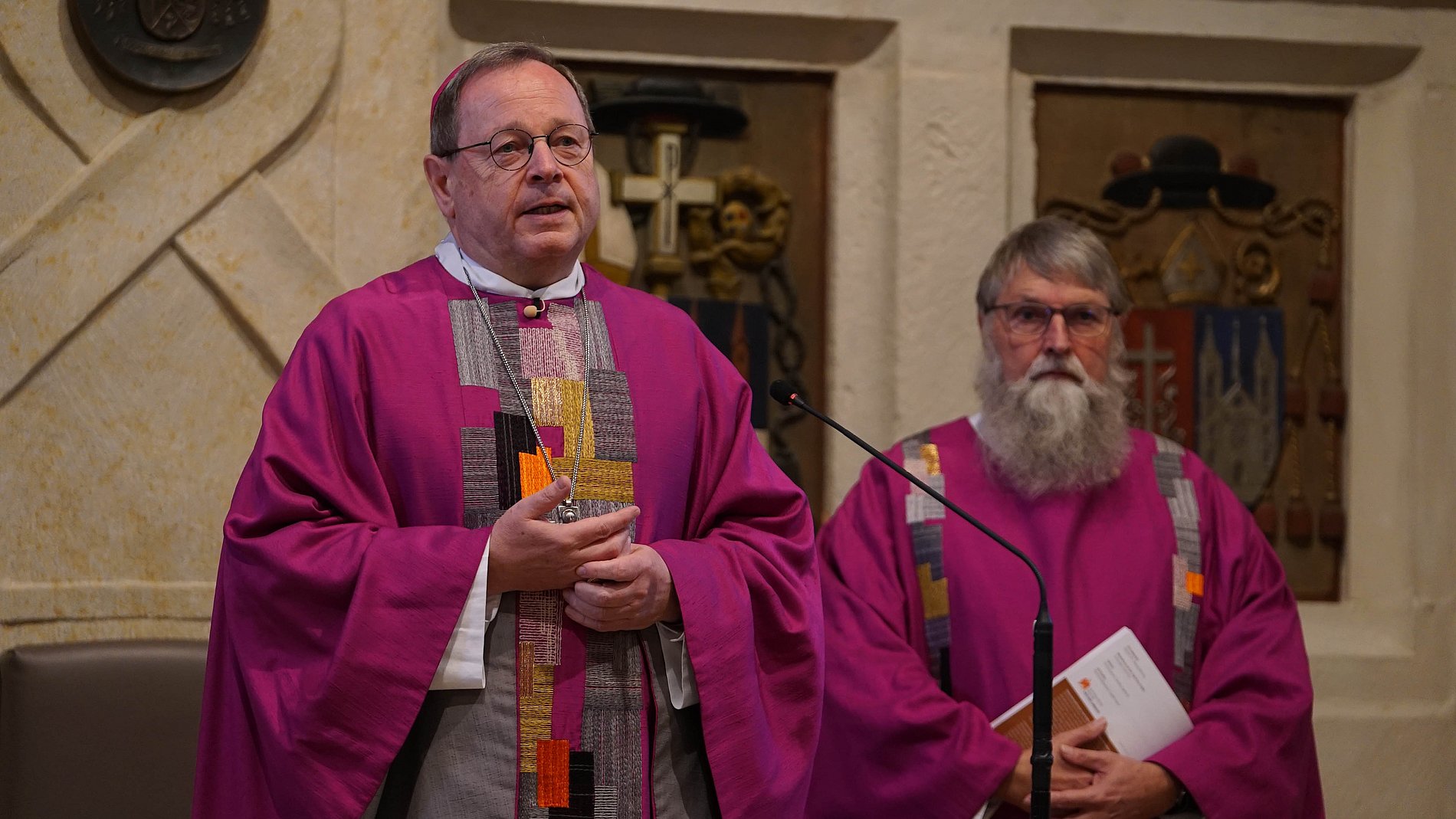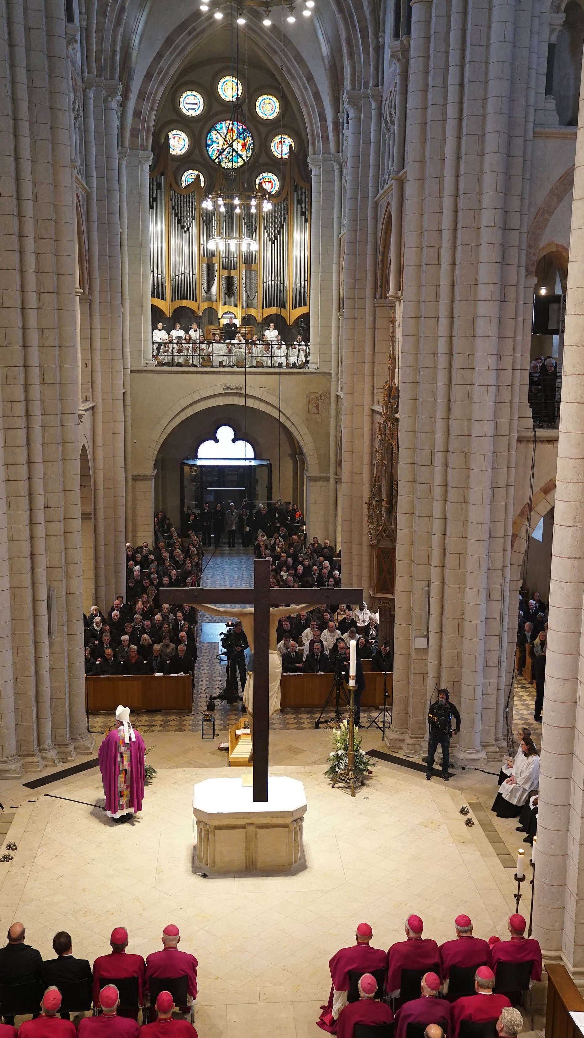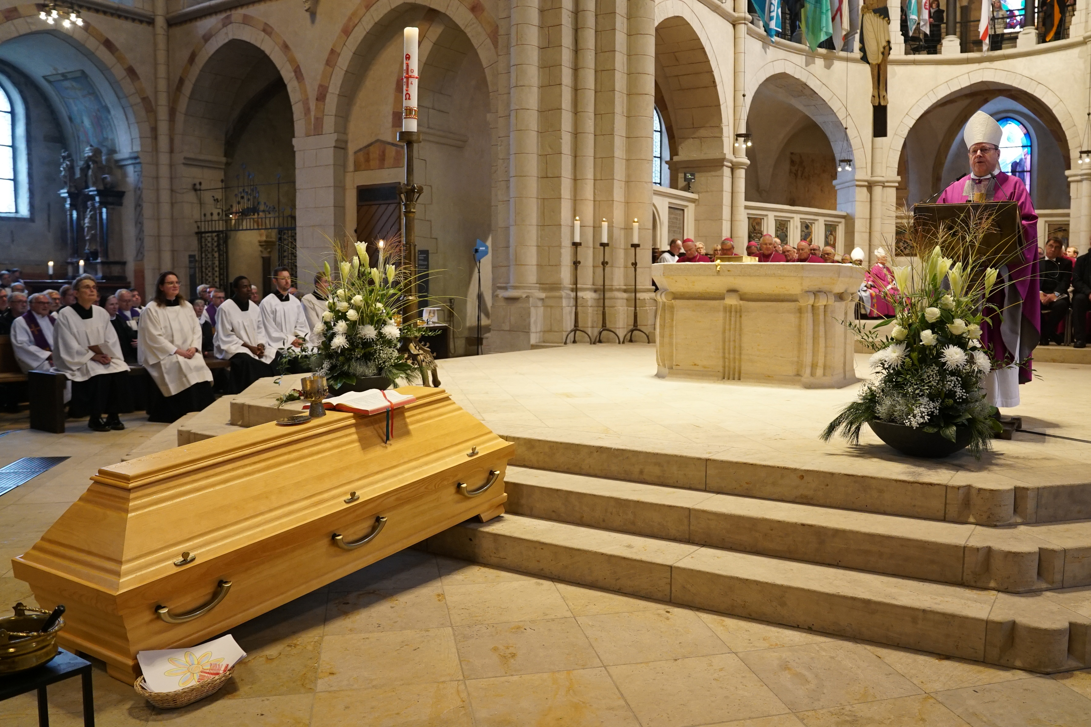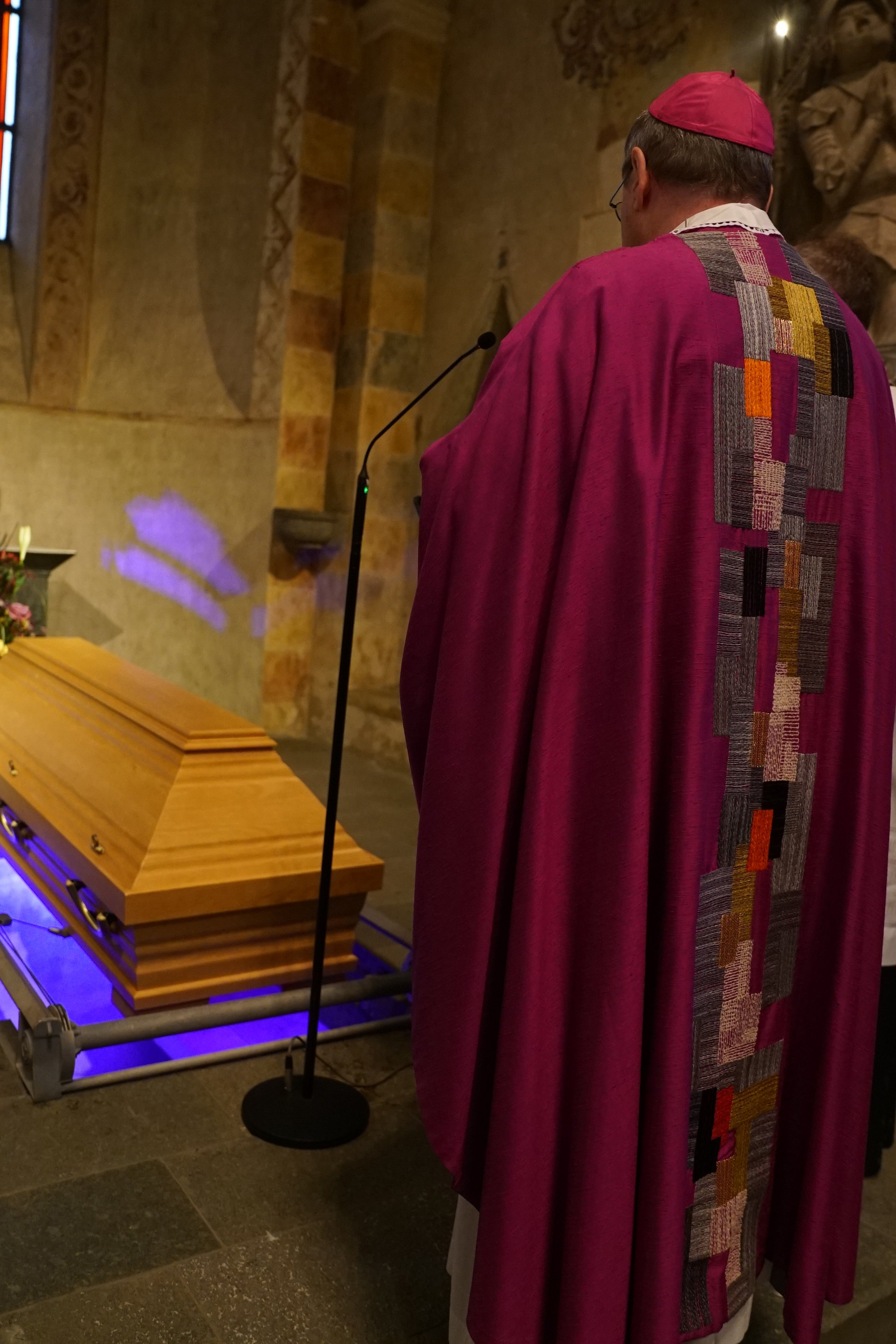 Bischof Bätzing blickte auch auf das Leitwort „Evangelizare pauperibus – den Armen die Frohe Botschaft verkünden“, das sich Franz Kamphaus für seinen Bischofsdienst gewählt hatte. Bereits in dem Leitwort drücke sich die Ausrichtung seines Wirkens aus. Bischof Kamphaus sei ein Mann des Wortes gewesen. Er habe auf das Wort Gottes gehört, sich davon inspirieren lassen und es dann verkündet. Wenn Kamphaus zur Predigt aufstand, dann habe man klare Worte und tiefe Einsichten erwarten können. „Mit seinem Charisma hat er nie gegeizt. Denn es geht ja wahrhaftig um viel. Unser Zeugnis in Worten und Taten ist die Weise, wie Jesus bis heute Menschen erreichen will, um ihre Herzen zu erneuern“, so Bätzing. Gott mache den Menschen immer sein Angebot, für sie da zu sein. Jesus Christus befreie. Sein Zeichen sei das Kreuz. „Hier in Limburg lassen wir uns jedes Jahr beim Kreuzfest daran erinnern. Mehr und Größeres als das Kreuz, Zeichen des demütigen Herrn, der unsere Not teilt, und Zeichen des in Herrlichkeit Auferstandenen, der uns vorangeht, mehr und Größeres haben wir nicht zu geben“, sagte der Bischof. Im Kreuz sei Heil, im Kreuz sei Leben, im Kreuz sei Hoffnung. „Das ist die Voranzeige des kommenden ewigen Lebens. Du, lieber Bischof Franz, darfst es nun kosten. Das ist dein Lohn“, so Bätzing.