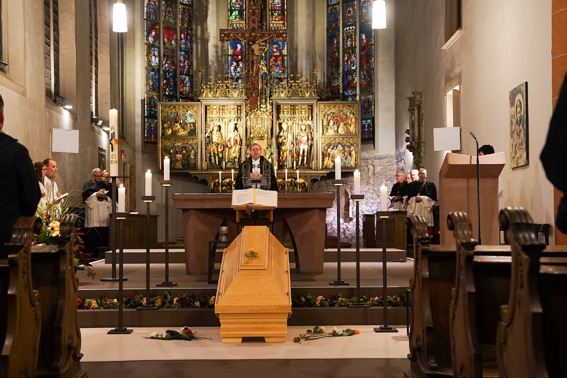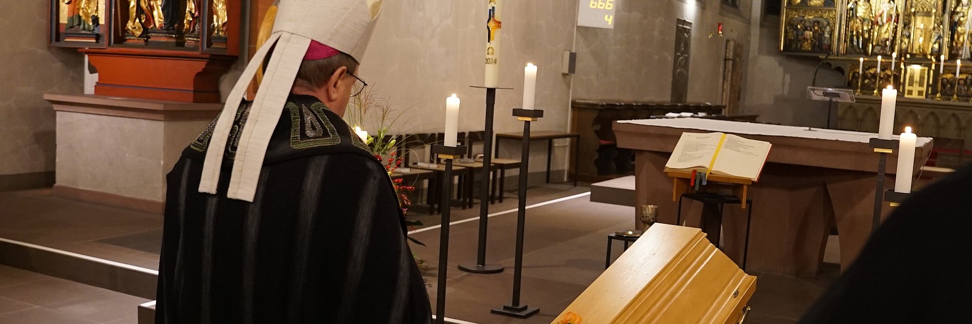 Am Sonntag, 3. November 2024, hat Bischof Georg Bätzing gemeinsam mit dem Limburger Domkapitel und vielen Gläubigen eine Totenvesper für Altbischof Franz Kamphaus gefeiert. In der Limburger Stadtkirche kamen etwa 300 Personen zusammen, um dem Verstorbenen zu gedenken. In der Vesper wurden auch Texte von Altbischof Kamphaus vorgelesen, die der Verstorbene im Jahr 2023 im Buch „Der Unbekannte aus Nazaret. Inspirationen zum Markus-Jahr“ veröffentlicht hatte. „Er soll heute Abend selbst noch einmal zu Wort kommen in drei kurzen Abschnitten aus seinem letzten Buch. Erst im vergangenen Jahr hat er es vollendet mit Gedanken, die vielen zu Herzen gehen“, sagte Bischof Bätzing zur Einleitung.