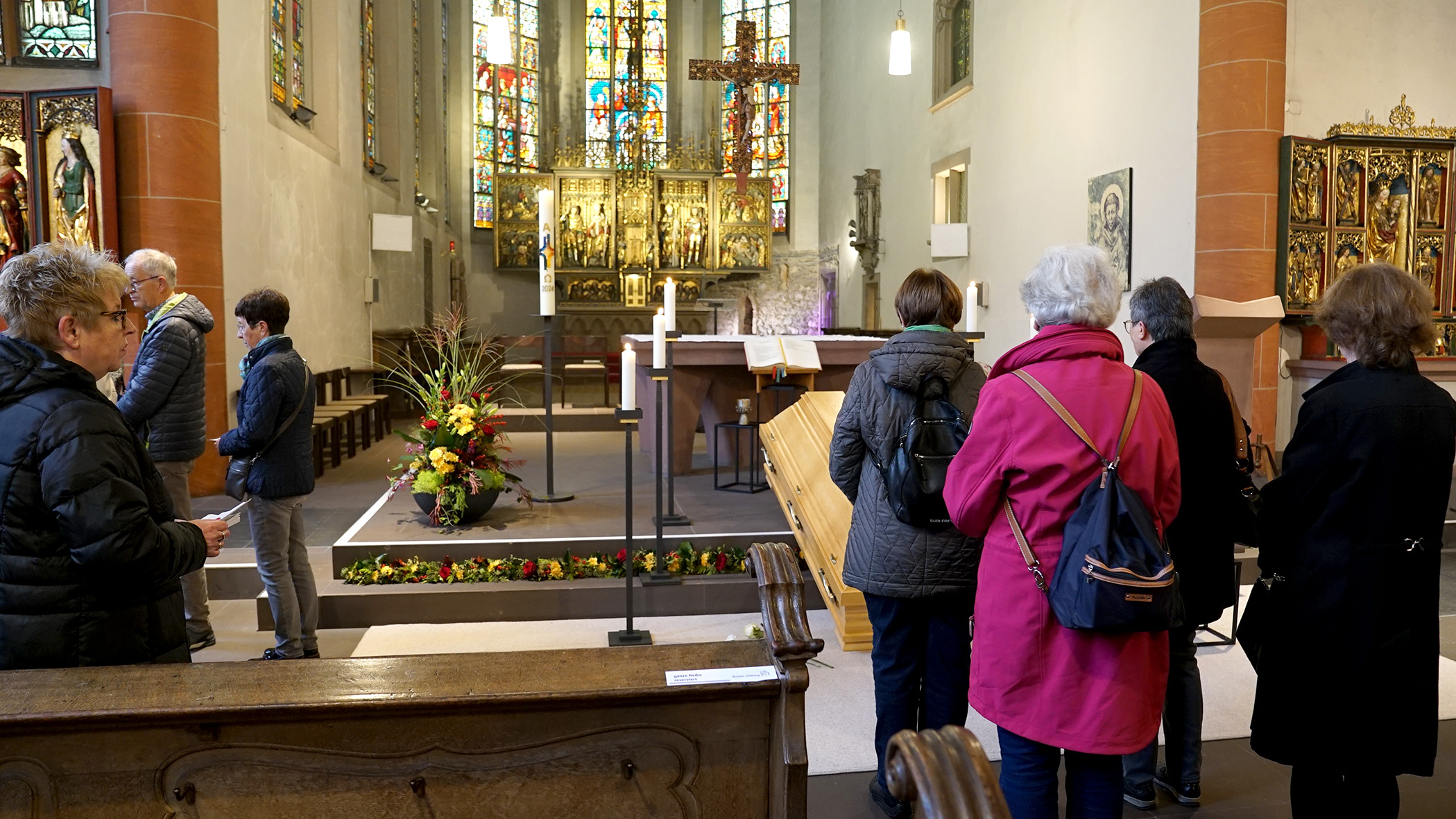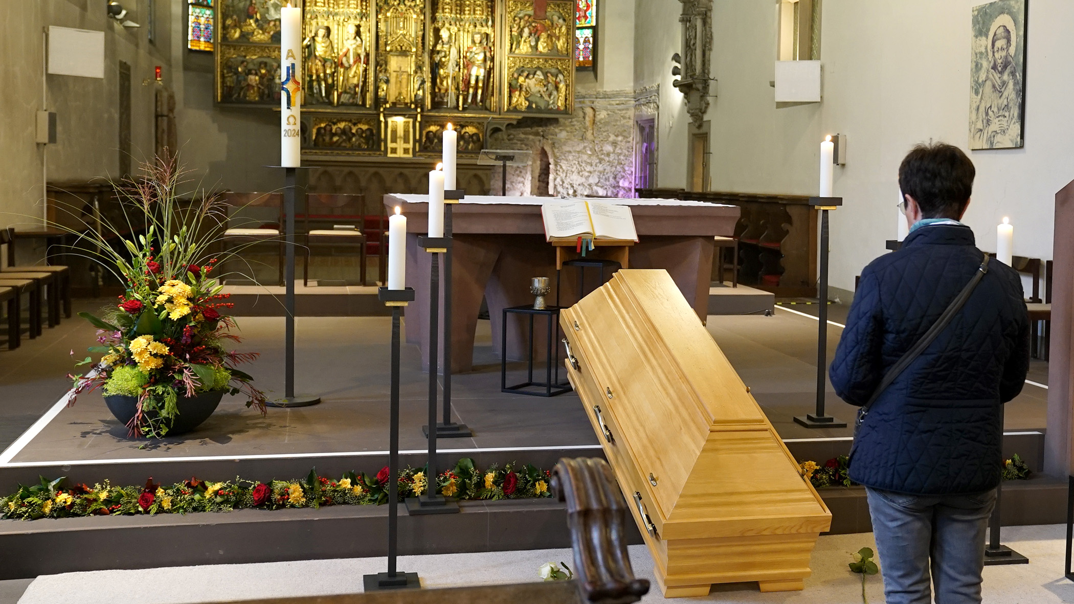 Der verstorbene Bischof em. Dr. Franz Kamphaus ist am Samstag, 2. November 2024, in der Stadtkirche Limburg aufgebahrt worden. Bis einschließlich Montag, 4. November, können Gläubige dort am geschlossenen Sarg des früheren Limburger Bischofs Abschied nehmen und sich in das ausgelegte Kondolenzbuch eintragen.